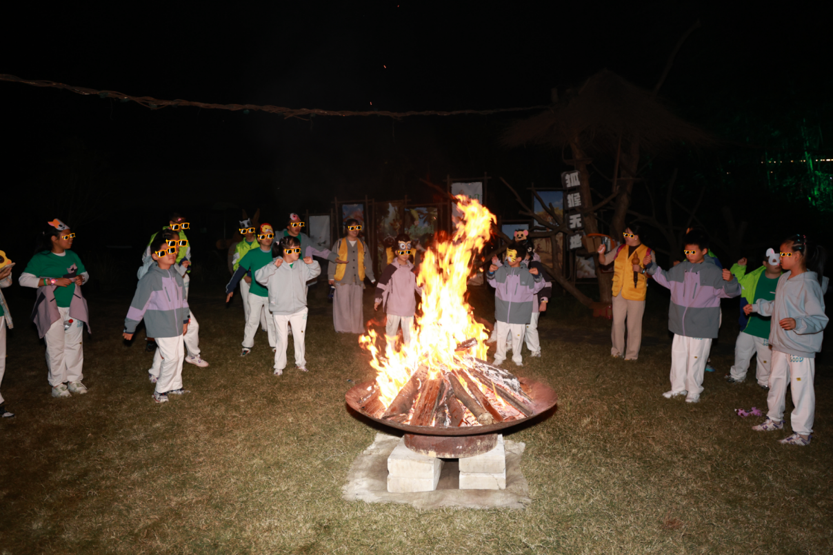夜晚篝火下的化妆舞会,成为整场研学的高光时刻。熊熊燃烧的篝火照亮夜空,这是许多孩子从未体验过的新奇场景,跳动的火焰、专业表演者带来的喷火特技让兴奋的欢呼声此起彼伏,而孩子们佩戴着可爱的动物面具,围着篝火尽情狂欢,即兴展示唱歌、跳舞等才艺,更是点燃全场。火光映照下,每张笑脸都格外灿烂,孩子们在沉浸式体验中释放天性,也在互动协作中加深了友谊。