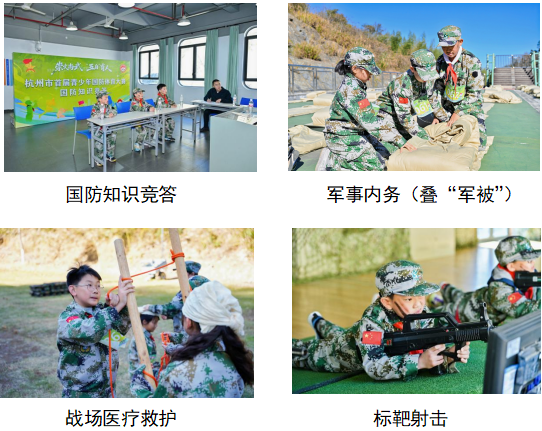 作为杭州首次聚焦青少年国防体育的专项赛事,活动紧紧围绕“崇文尚武,‘五自’育人”主题,创新采用“团体赛”与“个人赛”双轨赛制,全面考验青少年的国防素养和综合体能。其中,团体赛涵盖国防知识竞答、军事内务(叠“军被”)、战场医疗救护和标靶射击等四个项目,队员间通过讨论交流、相互协作、并肩作战,共同完成挑战任务,提高国防素养。