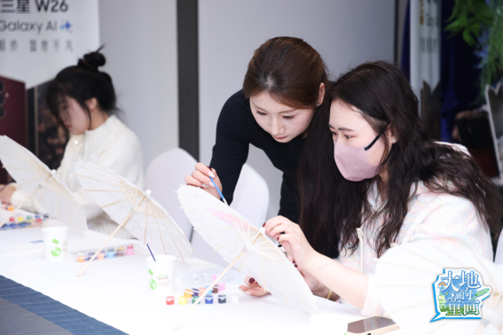 与画作区相呼应的,是充满江南气息的非遗体验区。本次杭州站将油纸伞绘制引入现场,让传统技艺成为连接童画与城市文化的媒介。在专业指导下,参与者以伞为纸,将西湖意象与个人理解融入笔触之中。