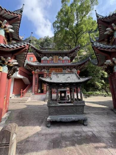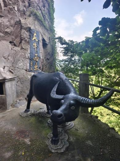 沿阶而上,我们开启了东蒙山的实地考察与精神文化探索之旅。山中清幽的环境里,绿木成荫,巨石上的刻字与各式建筑静静伫立在山路两旁,诉说着这里的故事。这些石刻与建筑不仅是东蒙山的历史见证,更是乌牛文化的核心载体,承载着乌牛人民的信仰与希望,见证了这片土地的变迁。而东蒙山的道教文化印记与 “牛” 的意象,源于两段脍炙人口的传说:一段是东晋道士葛洪曾在此炼丹,因此后世修建了多处道教建筑;另一段是乌牛人民遭遇水患时,一头金牛卧入江中消除水患,人们为感恩金牛、寄托平安愿望,将牛的形象建造在山上。